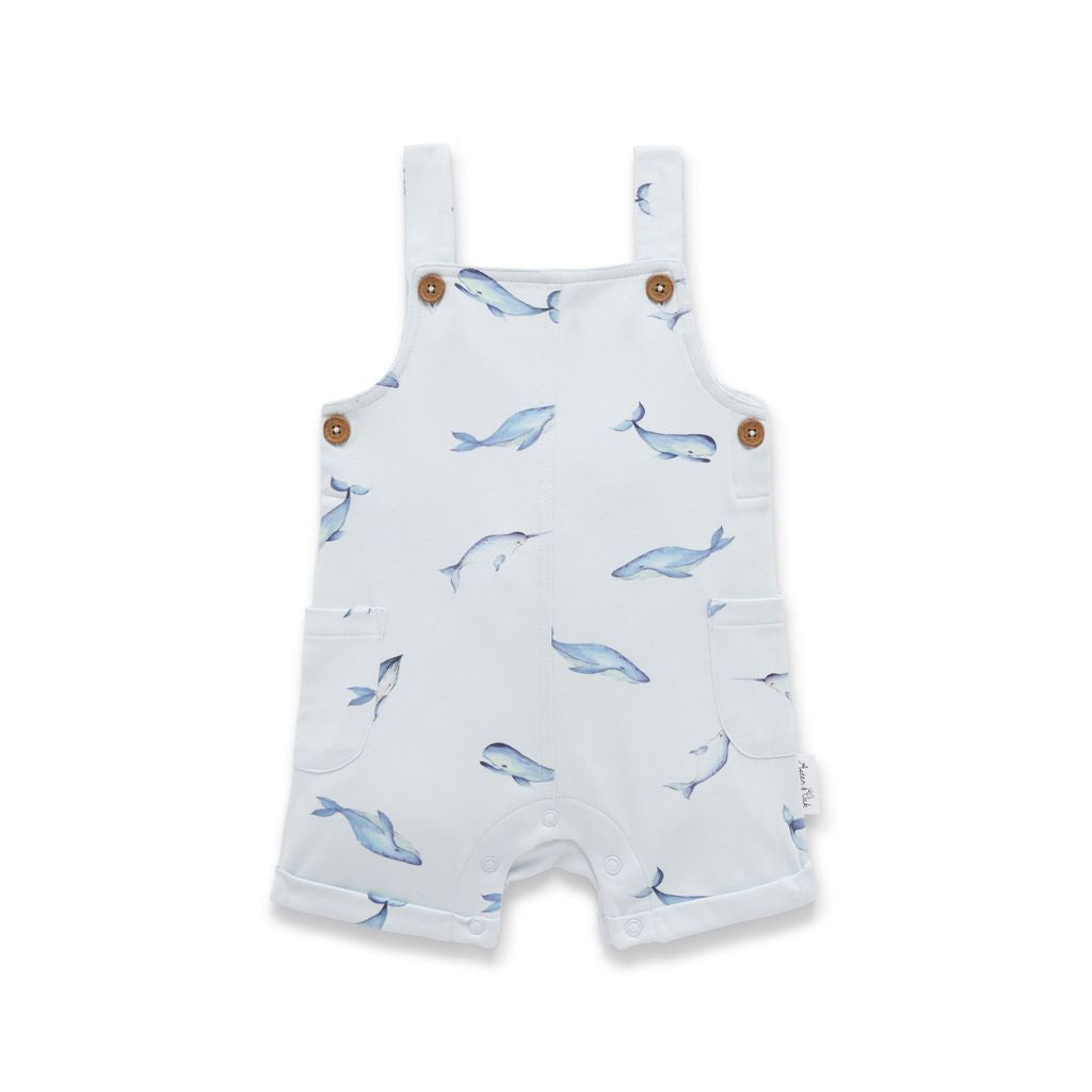 Made from GOTS, certified organic cotton, the overalls feature an all over whale print, functional side pockets, adjustable straps and buttons to the sides and gusset for quick and easy changing.